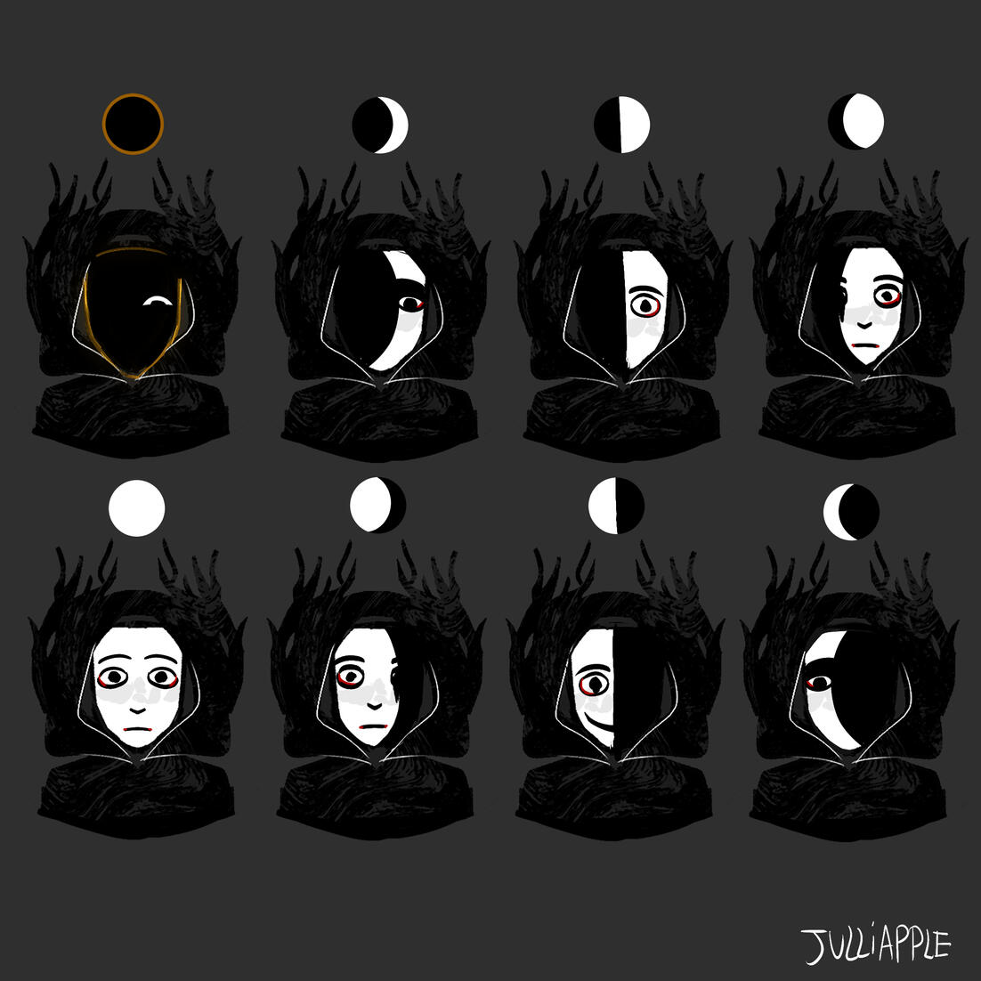He has great height, a hood, and small wooden horns that help him blend in with the trees; huge eyes with an unsettling and ever-fixed gazeThe fake moon can change its face according to the lunar phases.